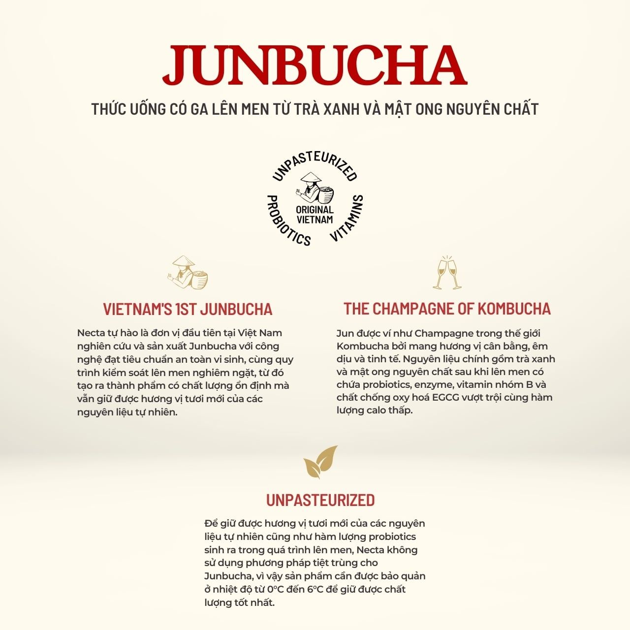 Necta tự hào là đơn vị đầu tiên tại Việt Nam nghiên cứu và sản xuất Junbucha với công nghệ đạt tiêu chuẩn an toàn vi sinh, cùng quy trình kiểm soát lên men nghiêm ngặt, từ đó tạo ra thành phẩm có chất lượng ổn định mà vẫn giữ được hương vị tươi mới của các nguyên liệu tự nhiên. Với mong muốn tạo ra một đồ uống lên men không chỉ làm hài lòng các giác quan khi thưởng thức, Necta nỗ lực tìm kiếm và nghiên cứu các nguồn nguyên liệu thiên nhiên để Junbucha thực sự mang đến lợi ích về sức khoẻ cho người uống. Jun được ví như Champagne trong thế giới Kombucha bởi mang hương vị êm mượt, cân bằng và tinh tế. Nguyên liệu chính gồm mật ong nguyên chất và trà xanh sau khi lên men có chứa probiotics, enzyme, vitamin nhóm B và hàm lượng EGCG chống oxy hoá vượt trội.